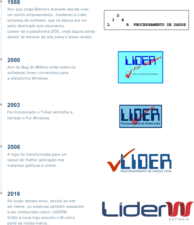 Vivemos em constante evolução, seja profissionalmente ou em nossa vida pessoal, com a Líderw não é diferente. Abaixo confira a evolução da nossa logomarca: